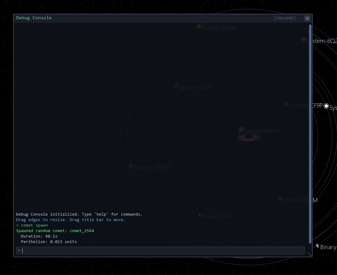 Originally, I had comets in the game but only as defensive events (which need a much-needed overhaul). Now comets are directly integrated into SystemBuilder, this allows them to utilize the generated math that is made for every simulated star system and galaxy, giving them real simulated orbital trajectories and eventually gaining enough momentum from the systems star to shoot out of the system using a gravitational slingshot effect (which gives about 2.5-4x velocity boost on the final pass).